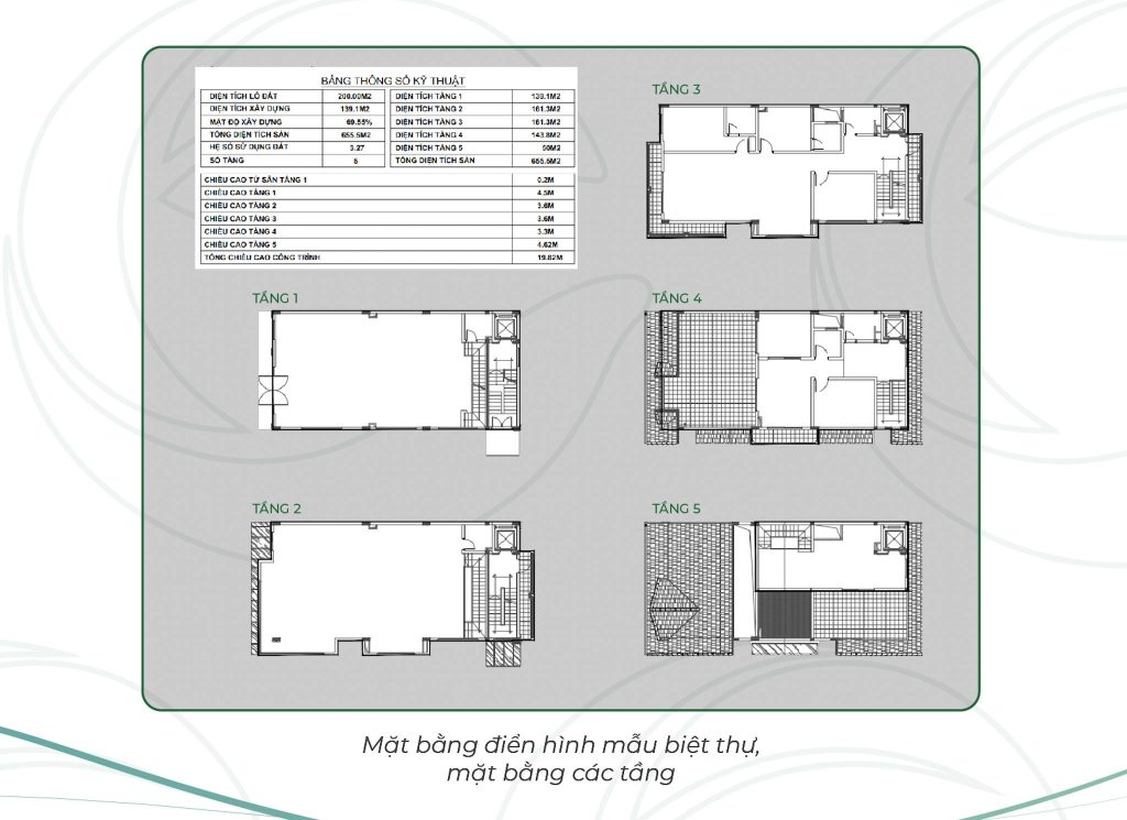 | SỐ TẦNG | 5 | TỔNG DIỆN TÍCH SÀN | 655.5 M2 |
