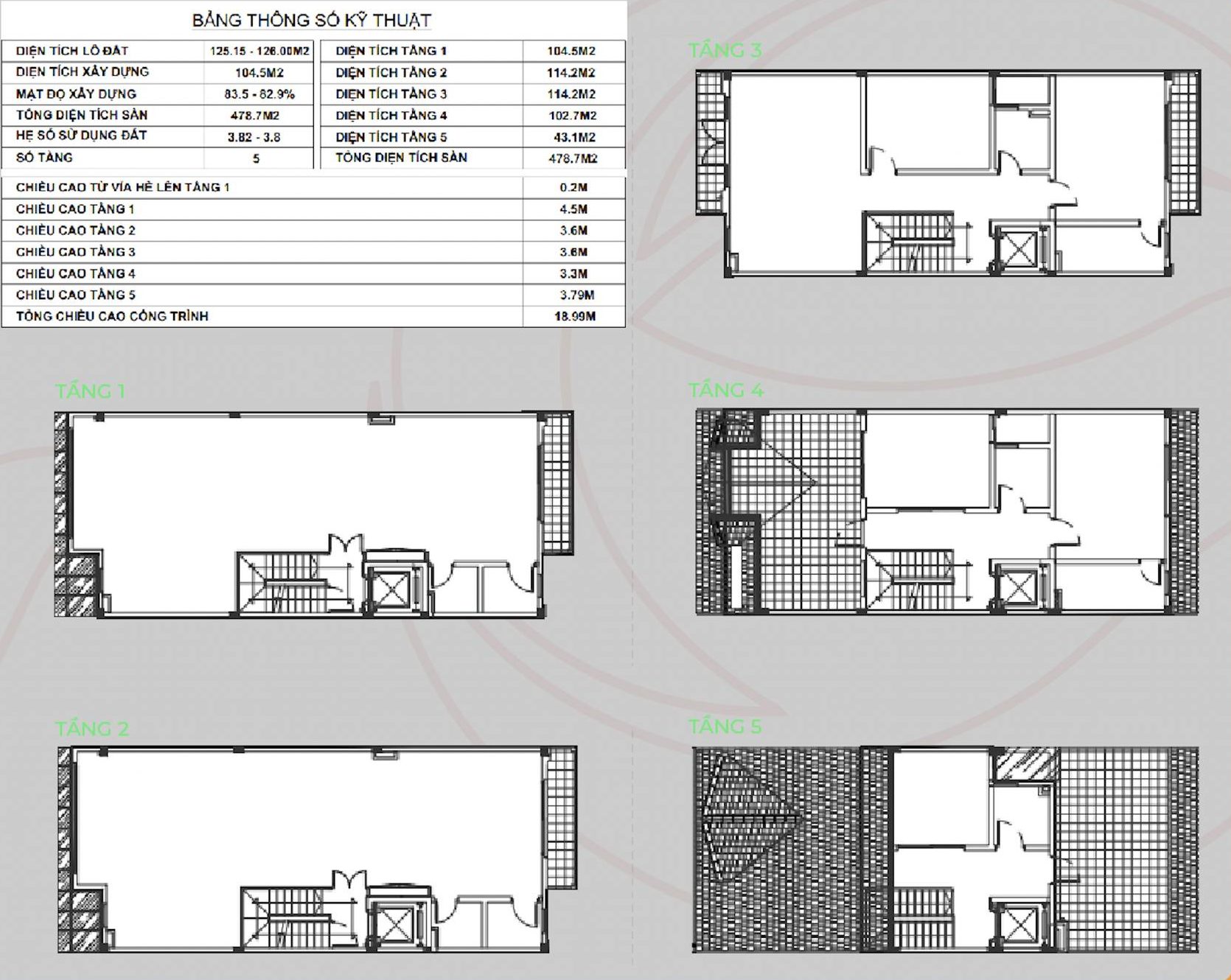 | SỐ TẦNG | 5 | TỔNG DIỆN TÍCH SÀN | 478.7 M2 |